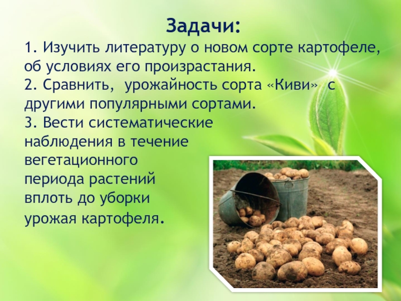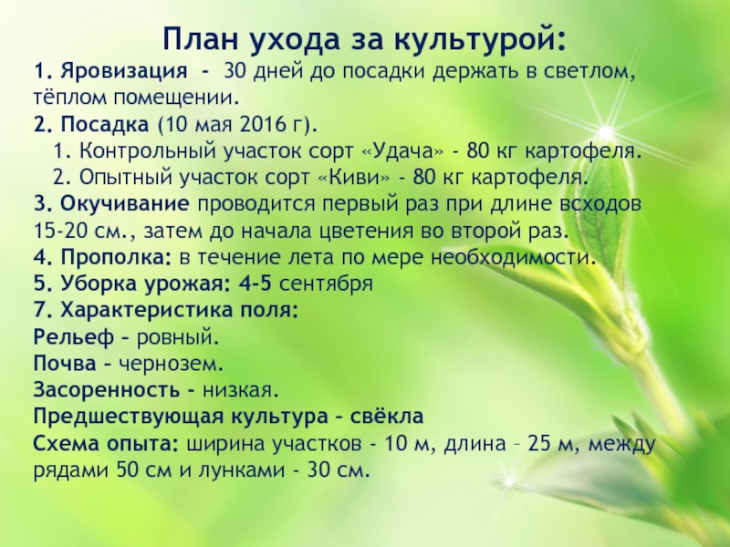 1. Изучить литературу о новом сорте картофеле, об условиях его произрастания.