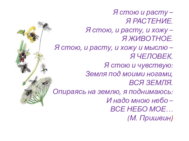 Я стою и расту – Я РАСТЕНИЕ.Я стою, и расту, и хожу – Я ЖИВОТНОЕ.Я стою, и расту, и хожу и мыслю – Я ЧЕЛОВЕК.Я стою и чувствую:Земля под моими ногами, ВСЯ ЗЕМЛЯ.Опираясь на землю, я