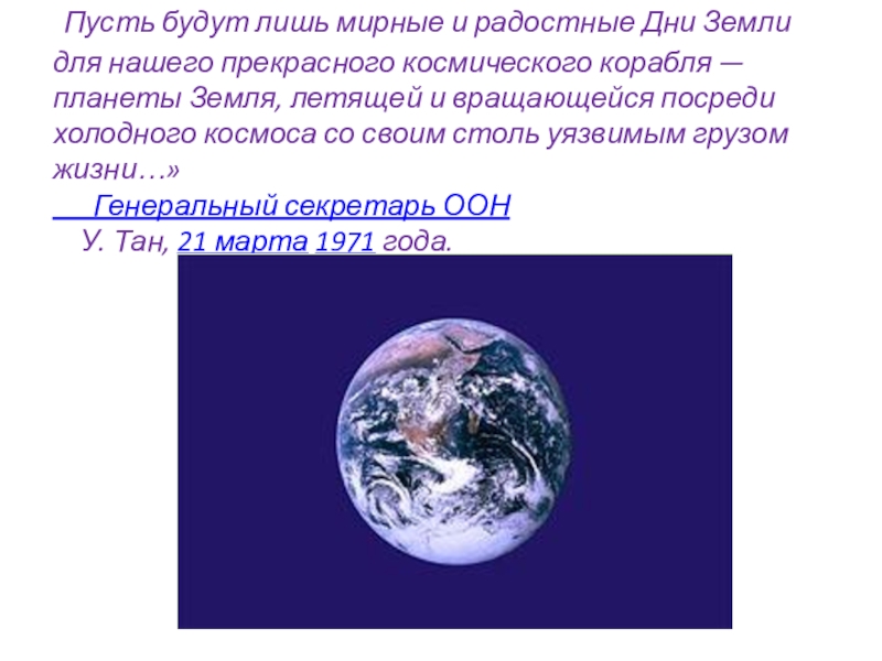 прекрасного космического корабля — планеты Земля, летящей и вращающейся посреди холодного космоса со своим столь уязвимым грузом жизни…» Генеральный секретарь ООН У. Тан, 21 марта 1971 года.