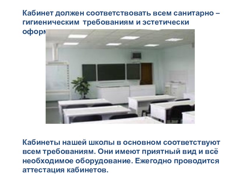 Кабинеты нашей школы в основном соответствуют всем требованиям. Они имеют приятный вид и всё необходимое оборудование. Ежегодно проводится аттестация кабинетов.
