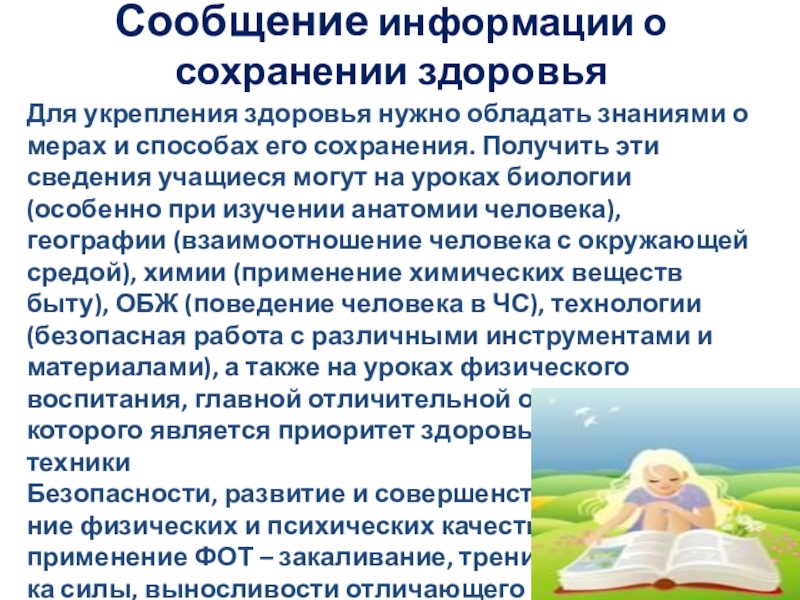 мерах и способах его сохранения. Получить эти сведения учащиеся могут на уроках биологии (особенно при изучении анатомии человека), географии (взаимоотношение человека с окружающей средой), химии (применение химических веществ быту), ОБЖ (поведение человека в ЧС), технологии (безопасная работа с различными инструментами и материалами), а также на уроках физического воспитания, главной отличительной особенностью которого является приоритет здоровья ( соблюдение техники