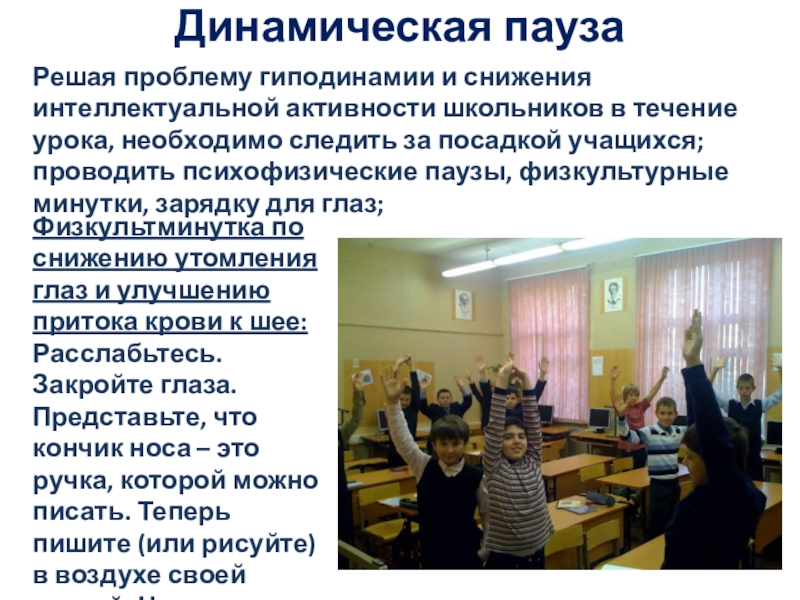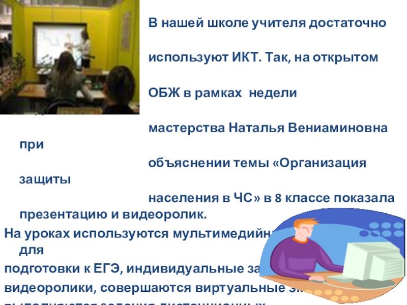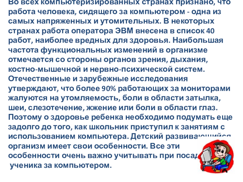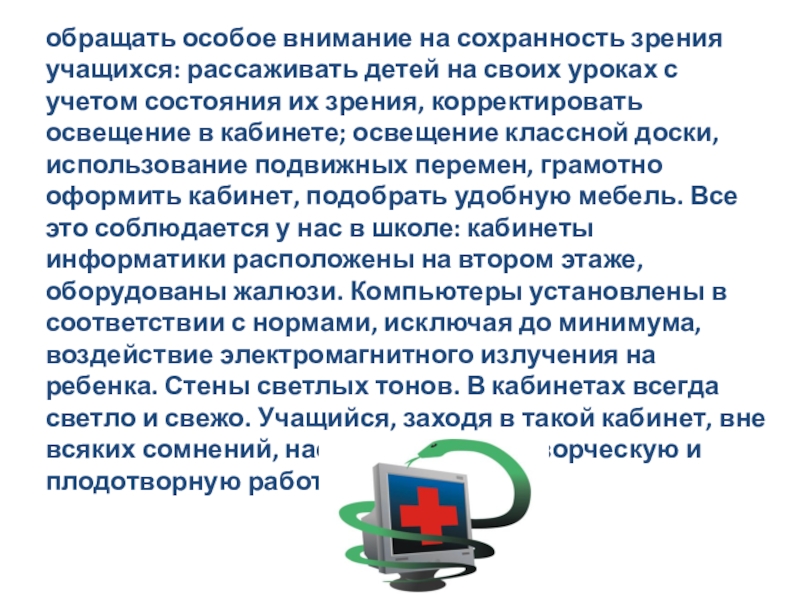 уроках с учетом состояния их зрения, корректировать освещение в кабинете; освещение классной доски, использование подвижных перемен, грамотно оформить кабинет, подобрать удобную мебель. Все это соблюдается у нас в школе: кабинеты информатики расположены на втором этаже, оборудованы жалюзи. Компьютеры установлены в соответствии с нормами, исключая до минимума, воздействие электромагнитного излучения на ребенка. Стены светлых тонов. В кабинетах всегда светло и свежо. Учащийся, заходя в такой кабинет, вне всяких сомнений, настраивается на творческую и плодотворную работу.