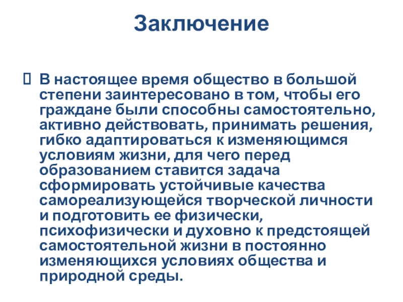 его граждане были способны самостоятельно, активно действовать, принимать решения, гибко адаптироваться к изменяющимся условиям жизни, для чего перед образованием ставится задача сформировать устойчивые качества самореализующейся творческой личности и подготовить ее физически, психофизически и духовно к предстоящей самостоятельной жизни в постоянно изменяющихся условиях общества и природной среды.