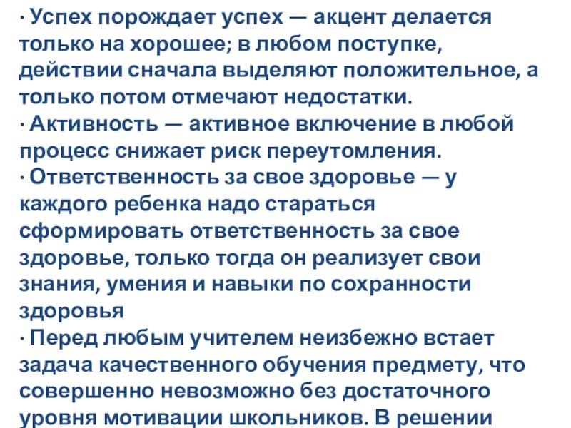 ∙ Перед любым учителем неизбежно встает задача качественного обучения предмету, что совершенно невозможно без достаточного уровня мотивации школьников. В решении означенных задач и могут помочь здоровьесберегающие технологии.