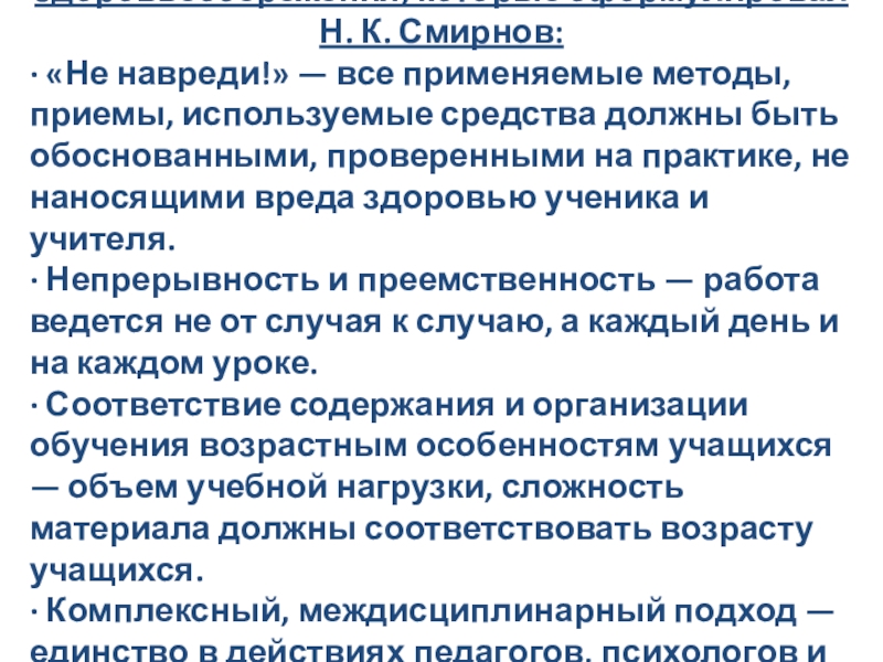 Слайд 15Технологии должны удовлетворять принципам здоровьесбережения, которые сформулировал Н. К. Смирнов: