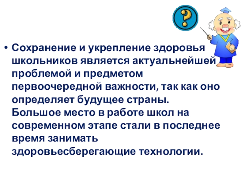 важности, так как оно определяет будущее страны. Большое место в работе школ на современном этапе стали в последнее время занимать здоровьесберегающие технологии.