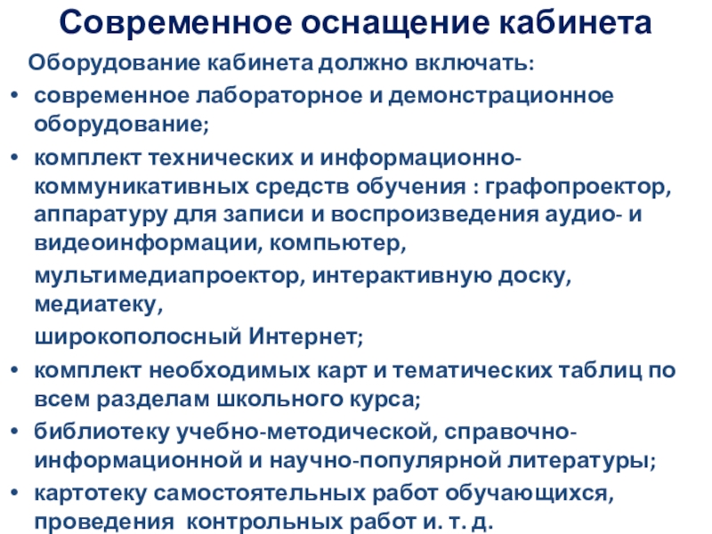 Оборудование кабинета должно включать: