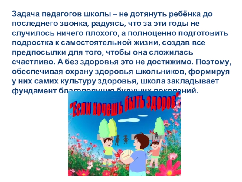 что за эти годы не случилось ничего плохого, а полноценно подготовить подростка к самостоятельной жизни, создав все предпосылки для того, чтобы она сложилась счастливо. А без здоровья это не достижимо. Поэтому, обеспечивая охрану здоровья школьников, формируя у них самих культуру здоровья, школа закладывает фундамент благополучия будущих поколений.
