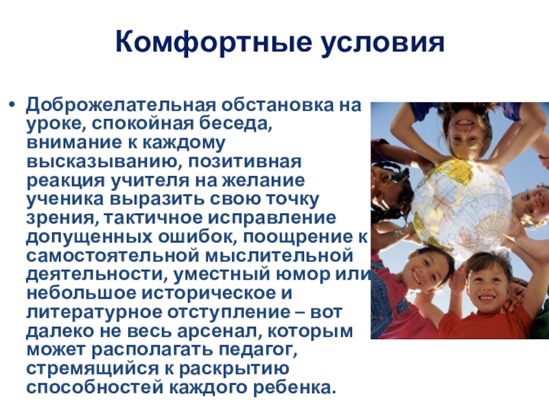 Доброжелательная обстановка на уроке, спокойная беседа, внимание к каждому высказыванию,