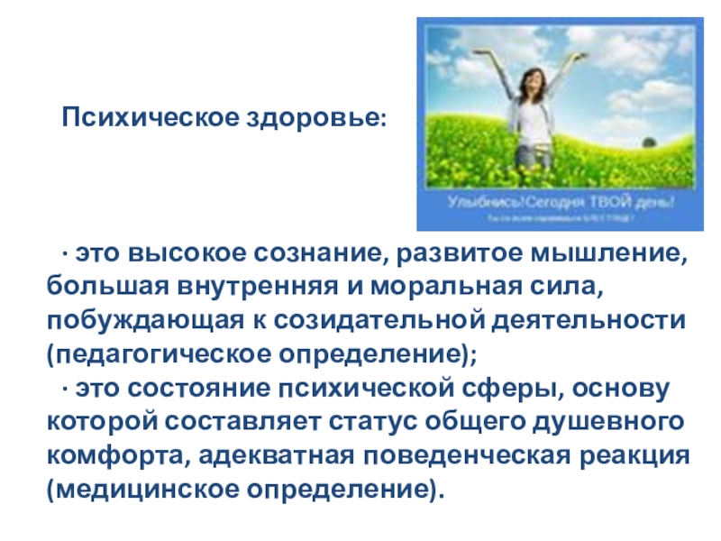 · это состояние психической сферы, основу которой составляет статус общего душевного комфорта, адекватная поведенческая реакция (медицинское определение).