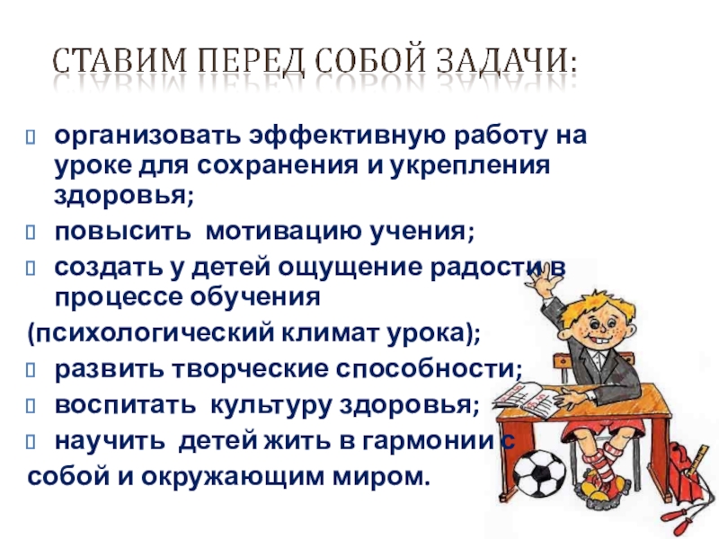 Слайд 14организовать эффективную работу на уроке для сохранения и укрепления здоровья;