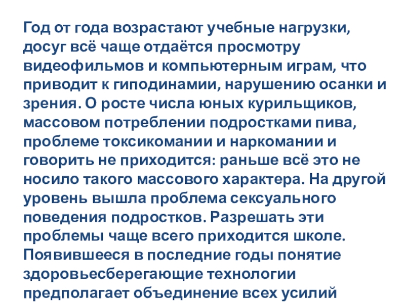 видеофильмов и компьютерным играм, что приводит к гиподинамии, нарушению осанки и зрения. О росте числа юных курильщиков, массовом потреблении подростками пива, проблеме токсикомании и наркомании и говорить не приходится: раньше всё это не носило такого массового характера. На другой уровень вышла проблема сексуального поведения подростков. Разрешать эти проблемы чаще всего приходится школе. Появившееся в последние годы понятие здоровьесберегающие технологии предполагает объединение всех усилий школы, нацеленных на сохранение, формирование и укрепление здоровья учащихся.