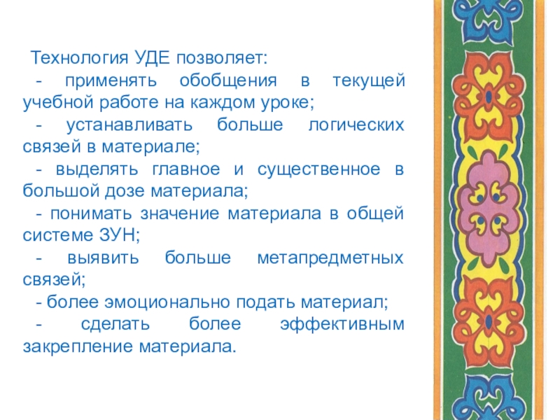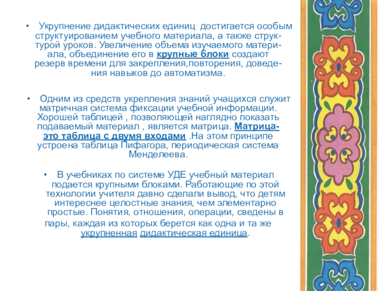 Сущность УДЕ сводится к объединению знаний во времени (урок, лекция) или в пространстве (разворот учебника и тетради). Элементы знания, распределённые ранее по разным разделам и годам обучения, объединяются и образуют тем самым целостный сплав структурно – новых знаний.