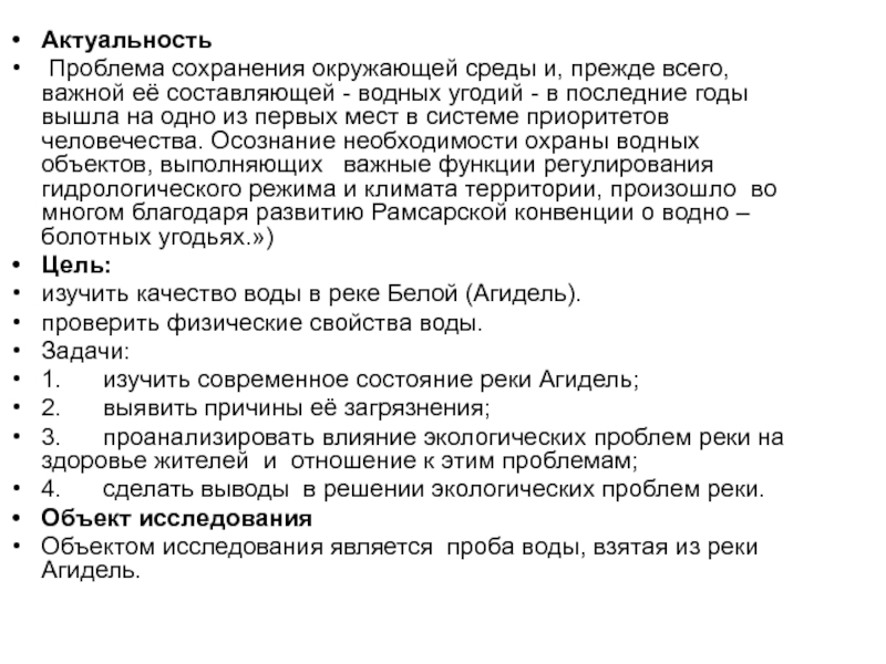 Актуальность Проблема сохранения окружающей среды и, прежде всего, важной её составляющей - водных угодий - в последние годы вышла на одно из первых мест в системе приоритетов человечества. Осознание необходимости охраны водных объектов, выполняющих   важные функции