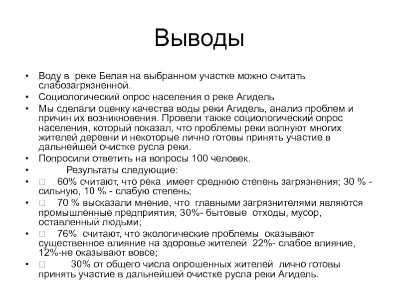 ВыводыВоду в реке Белая на выбранном участке можно считать слабозагрязненной.Социологический опрос населения о реке АгидельМы сделали оценку