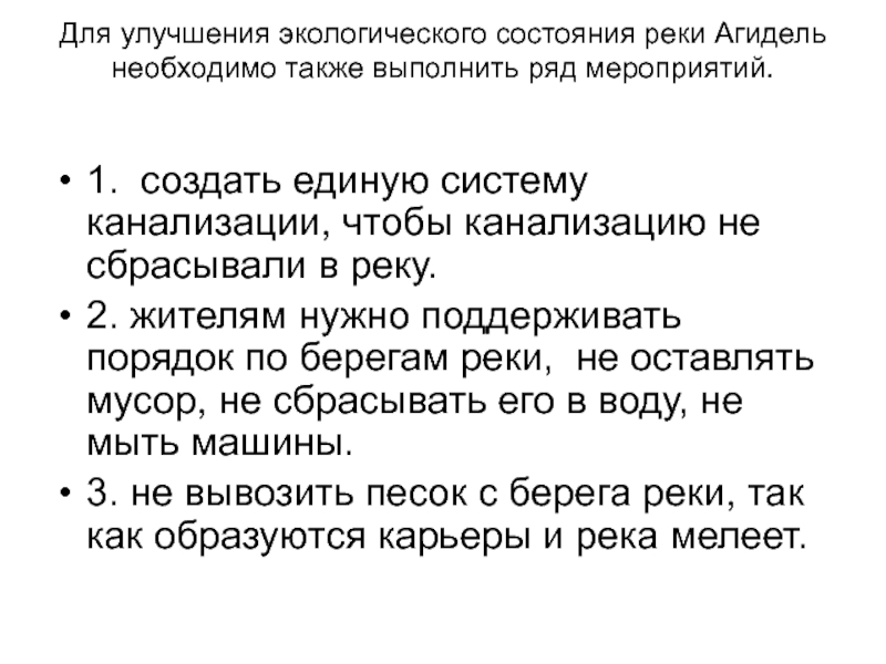 Для улучшения экологического состояния реки Агидель необходимо также выполнить ряд мероприятий. 1. создать единую систему канализации, чтобы
