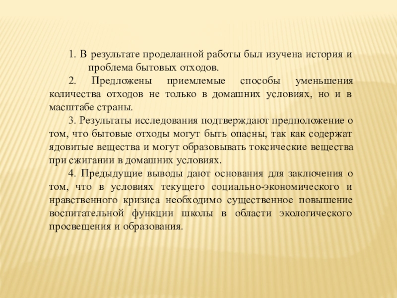 1. В результате проделанной работы был изучена история и проблема бытовых отходов.2. Предложены приемлемые способы уменьшения количества
