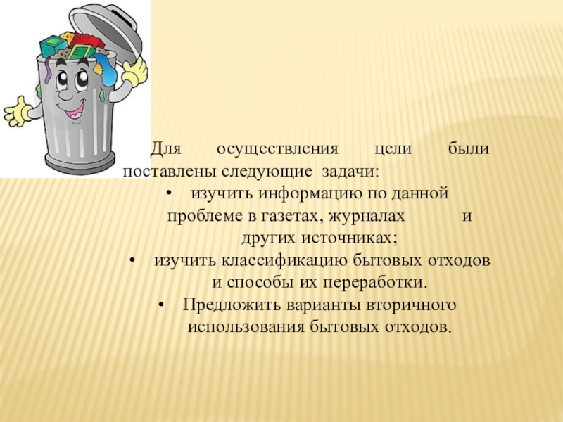 Цель исследования: изучить историю и проблемы бытовых отходов, и способы их вторичного использования.