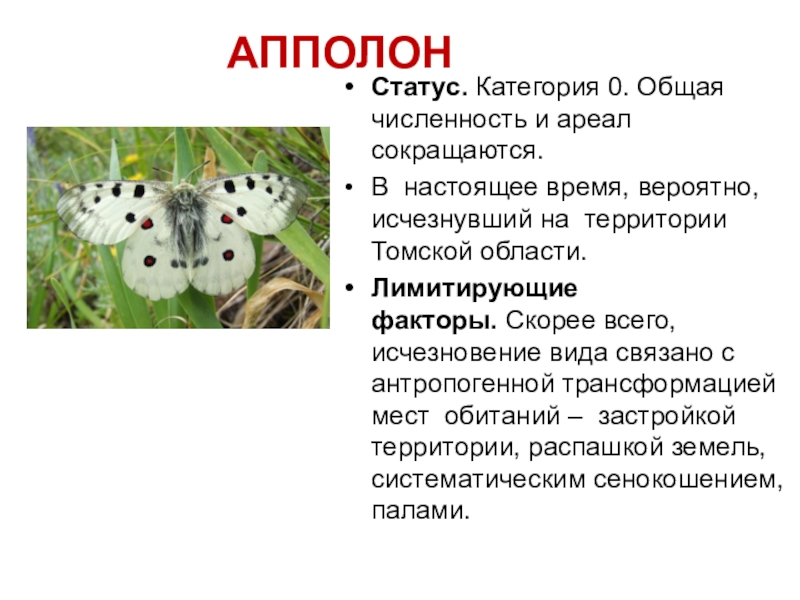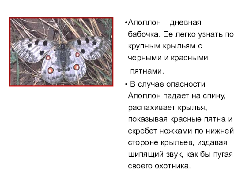 Слайд 9Аполлон – дневная бабочка. Ее легко узнать по крупным крыльям с