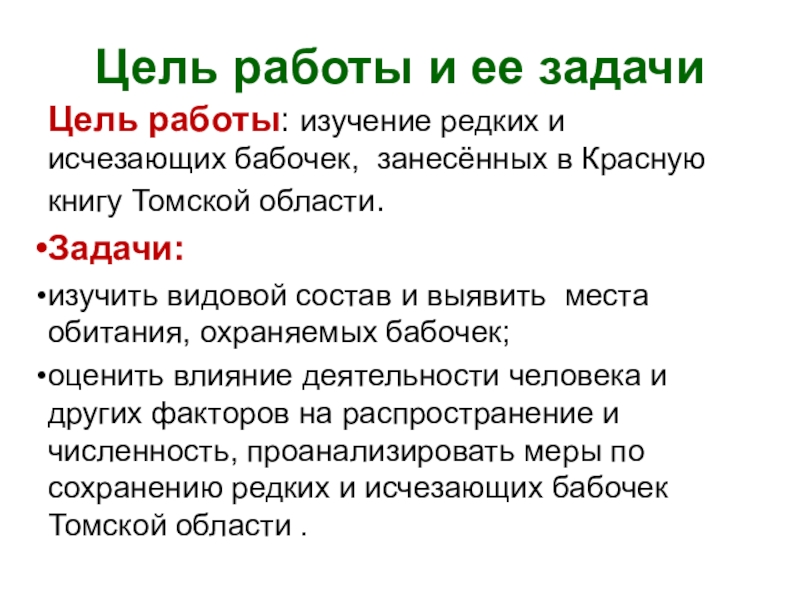 оценить влияние деятельности человека и других факторов на распространение и численность, проанализировать меры по сохранению редких и исчезающих бабочек Томской области .