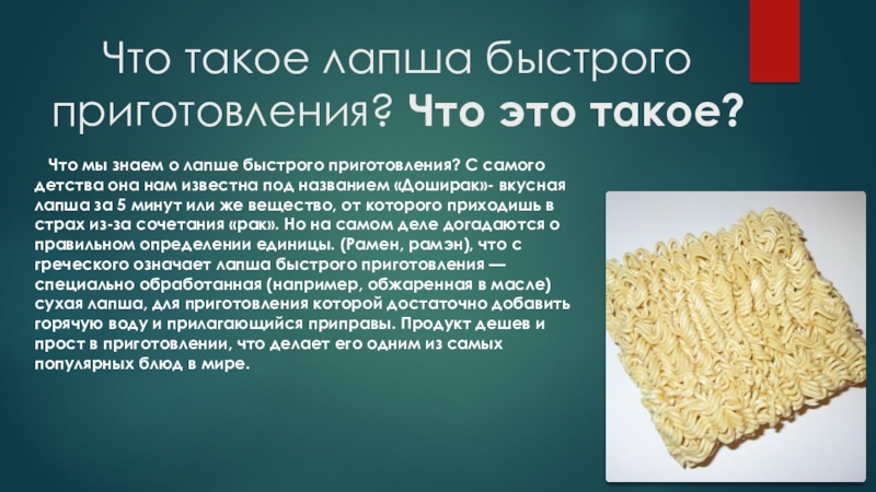 Слайд 5Что такое лапша быстрого приготовления? Что это такое?
