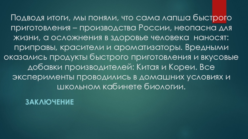Слайд 13Подводя итоги, мы поняли, что сама лапша быстрого приготовления – производства