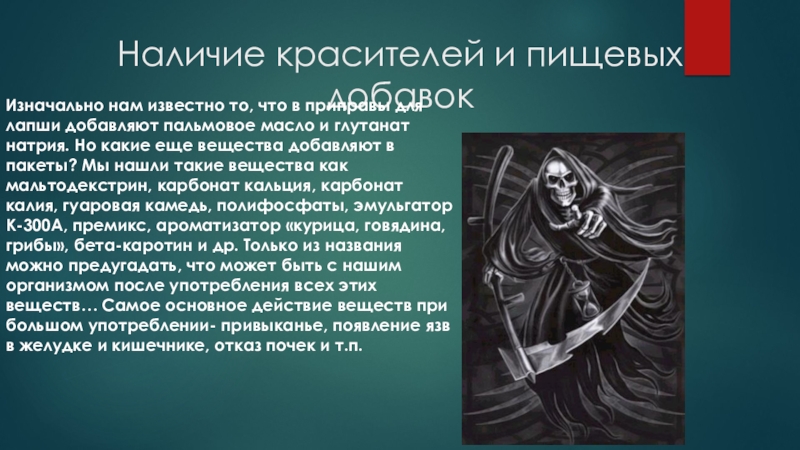приправы для лапши добавляют пальмовое масло и глутанат натрия. Но какие еще вещества добавляют в пакеты? Мы нашли такие вещества как мальтодекстрин, карбонат кальция, карбонат калия, гуаровая камедь, полифосфаты, эмульгатор К-300А, премикс, ароматизатор «курица, говядина, грибы», бета-каротин и др. Только из названия можно предугадать, что может быть с нашим организмом после употребления всех этих веществ… Самое основное действие веществ при большом употреблении- привыканье, появление язв в желудке и кишечнике, отказ почек и т.п.