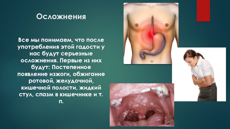серьезные осложнения. Первые из них будут: Постепенное появление изжоги, обжигание ротовой, желудочной, кишечной полости, жидкий стул, спазм в кишечнике и т.п.