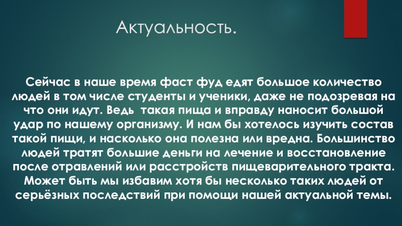 том числе студенты и ученики, даже не подозревая на что они идут. Ведь такая пища и вправду наносит большой удар по нашему организму. И нам бы хотелось изучить состав такой пищи, и насколько она полезна или вредна. Большинство людей тратят большие деньги на лечение и восстановление после отравлений или расстройств пищеварительного тракта. Может быть мы избавим хотя бы несколько таких людей от серьёзных последствий при помощи нашей актуальной темы.