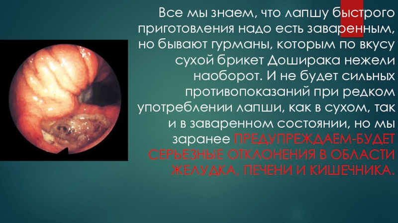 Слайд 8Все мы знаем, что лапшу быстрого приготовления надо есть заваренным, но