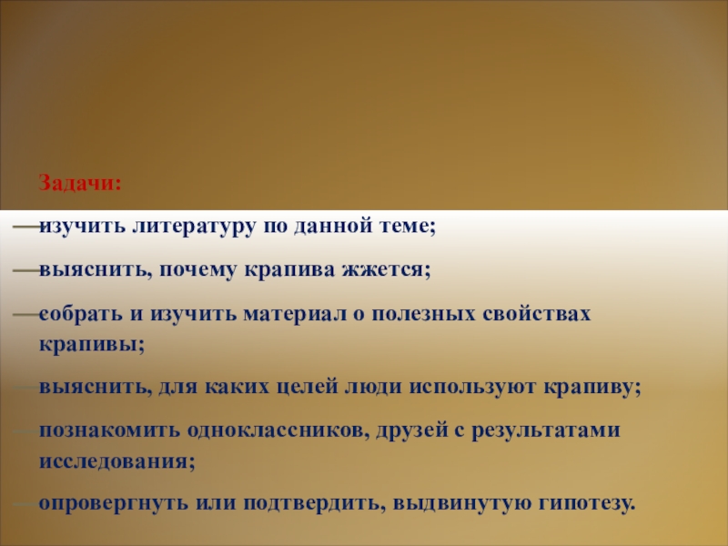 Задачи: изучить литературу по данной теме;выяснить, почему крапива жжется;собрать и изучить материал о полезных свойствах крапивы;выяснить, для