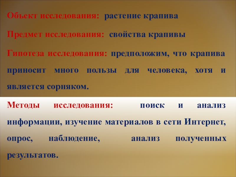 Объект исследования: растение крапиваПредмет исследования:  свойства крапивыГипотеза исследования: предположим, что крапива приносит много пользы для человека, хотя