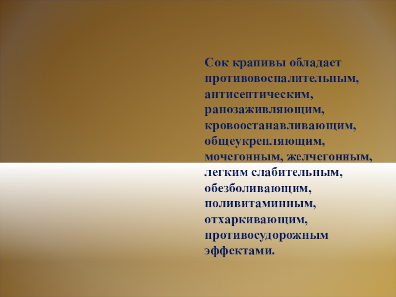 Слайд 7Сок крапивы обладает противовоспалительным, антисептическим, ранозаживляющим, кровоостанавливающим, общеукрепляющим, мочегонным, желчегонным, легким