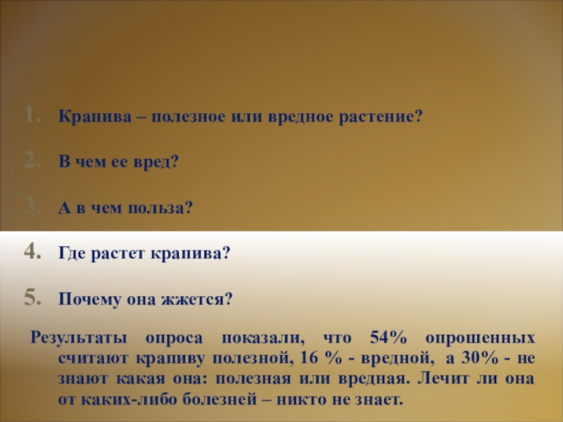Результаты опроса показали, что 54% опрошенных считают крапиву полезной, 16 % - вредной, а 30% - не знают какая она: полезная или вредная. Лечит ли она от каких-либо болезней – никто не знает.