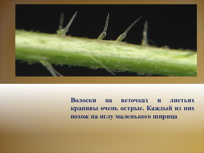 Слайд 6Волоски на веточках и листьях крапивы очень острые. Каждый из них