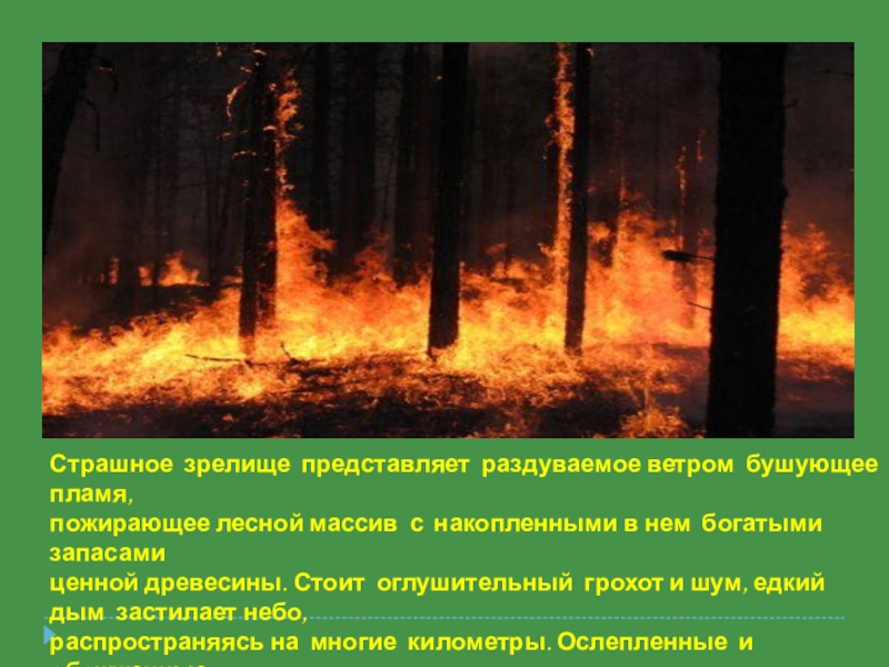 Слайд 30Страшное зрелище представляет раздуваемое ветром бушующее пламя,