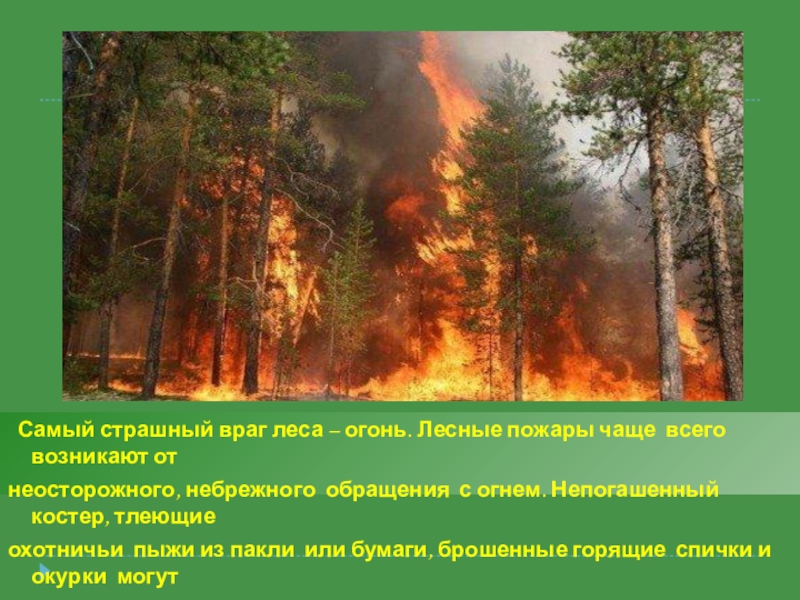 Слайд 29 Самый страшный враг леса – огонь. Лесные пожары чаще всего