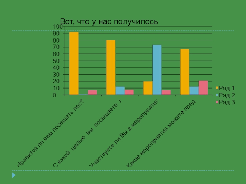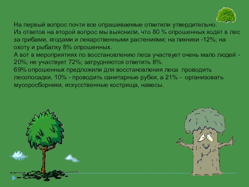 вопрос мы выяснили, что 80 % опрошенных ходят в лес за грибами, ягодами и лекарственными растениями; на пикники -12%; на охоту и рыбалку 8% опрошенных.