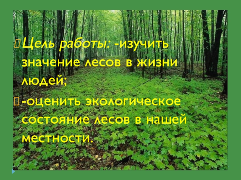 Слайд 3Цель работы: -изучить значение лесов в жизни людей;