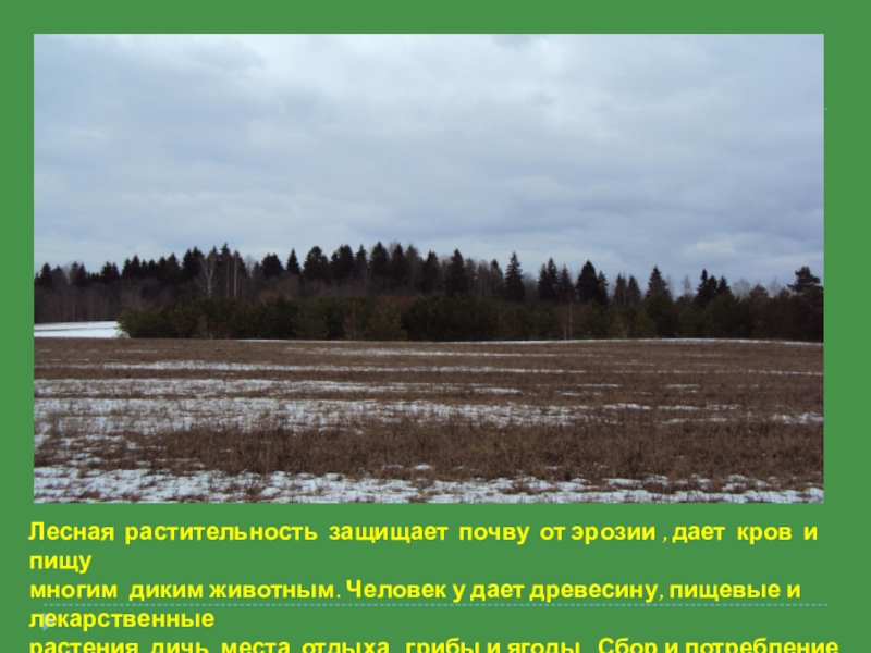 Слайд 11Лесная растительность защищает почву от эрозии , дает кров и пищу