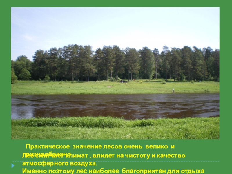 Слайд 9Лес смягчает климат , влияет на чистоту и качество атмосферного воздуха.