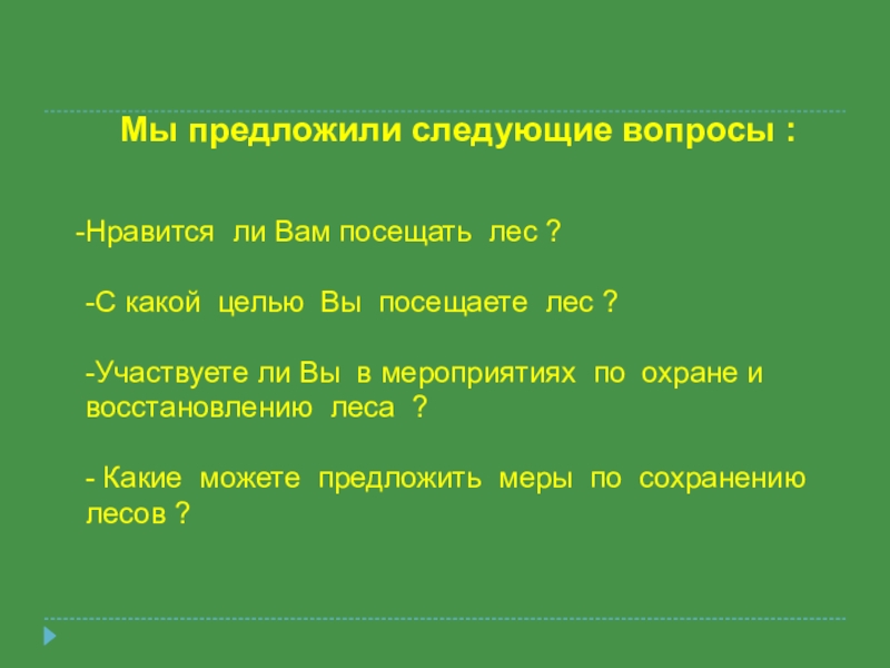 Цель социологического опроса: - выявить отношение жителей к лесу , узнать, как лес используется жителями, уточнить возможные меры по охране леса.
