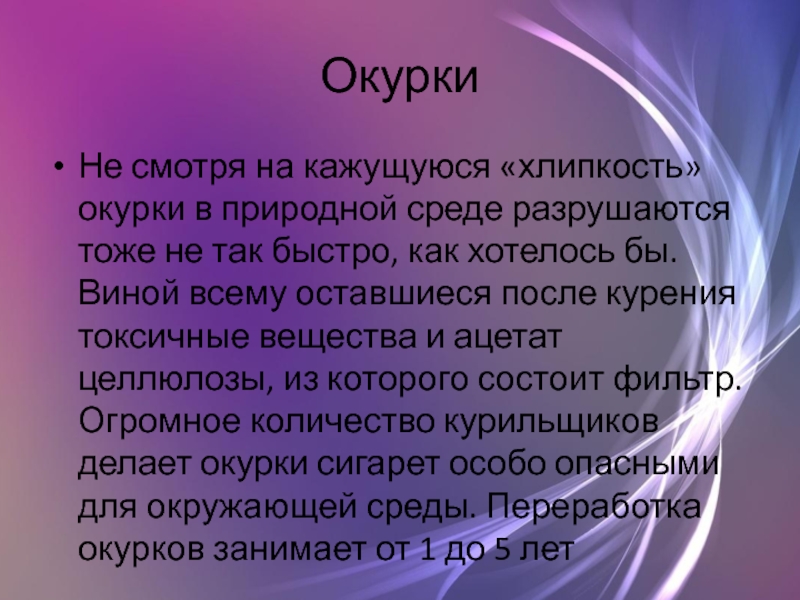 не так быстро, как хотелось бы. Виной всему оставшиеся после курения токсичные вещества и ацетат целлюлозы, из которого состоит фильтр. Огромное количество курильщиков делает окурки сигарет особо опасными для окружающей среды. Переработка окурков занимает от 1 до 5 лет