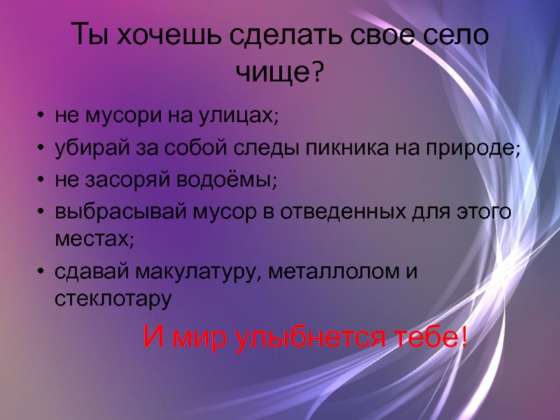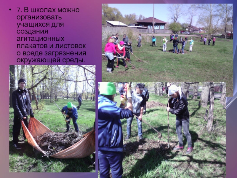 6. Регулярно проводить акции «Дни борьбы за экологическую безопасность» в городе или любом другом населенном пункте с обязательным подведением итогов средствами радио-, телевидения, прессы, превратить подобные акции в праздники.