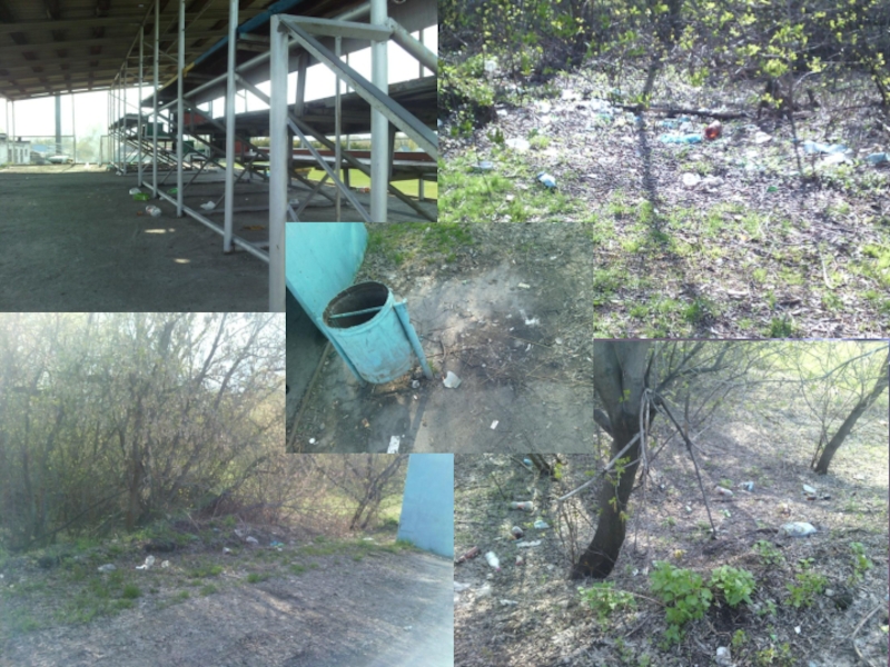 пачки из под сигарет, полиэтиленовые пакеты, фантики из под конфет, окурки.