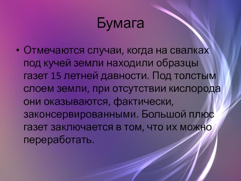 газет 15 летней давности. Под толстым слоем земли, при отсутствии кислорода они оказываются, фактически, законсервированными. Большой плюс газет заключается в том, что их можно переработать.