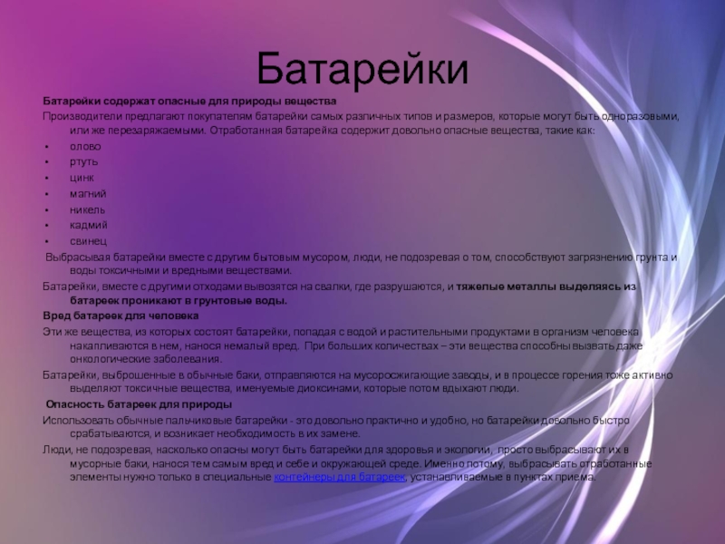 типов и размеров, которые могут быть одноразовыми, или же перезаряжаемыми. Отработанная батарейка содержит довольно опасные вещества, такие как: