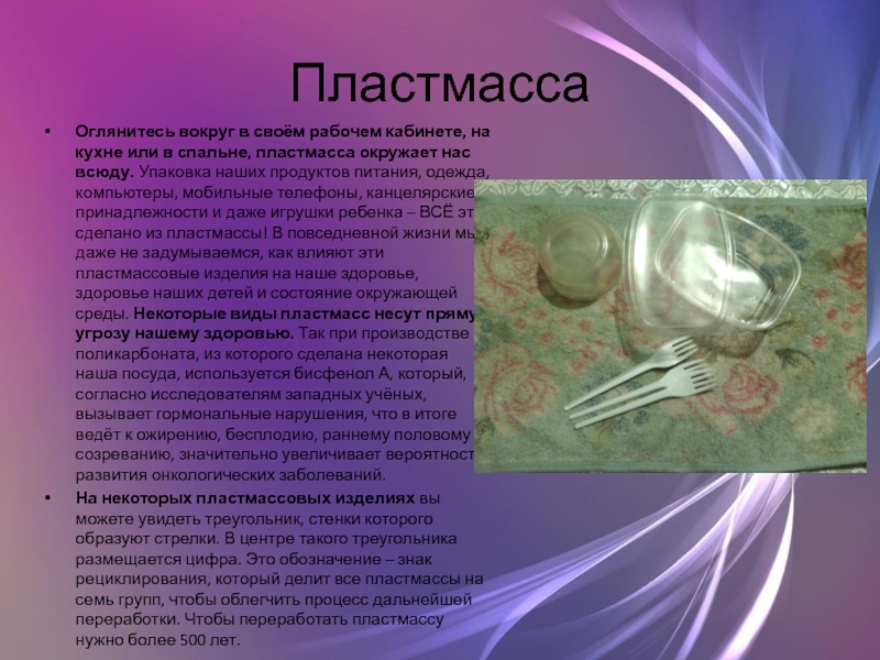пластмасса окружает нас всюду. Упаковка наших продуктов питания, одежда, компьютеры, мобильные телефоны, канцелярские принадлежности и даже игрушки ребенка – ВСЁ это сделано из пластмассы! В повседневной жизни мы даже не задумываемся, как влияют эти пластмассовые изделия на наше здоровье, здоровье наших детей и состояние окружающей среды. Некоторые виды пластмасс несут прямую угрозу нашему здоровью. Так при производстве поликарбоната, из которого сделана некоторая наша посуда, используется бисфенол А, который, согласно исследователям западных учёных, вызывает гормональные нарушения, что в итоге ведёт к ожирению, бесплодию, раннему половому созреванию, значительно увеличивает вероятность развития онкологических заболеваний.