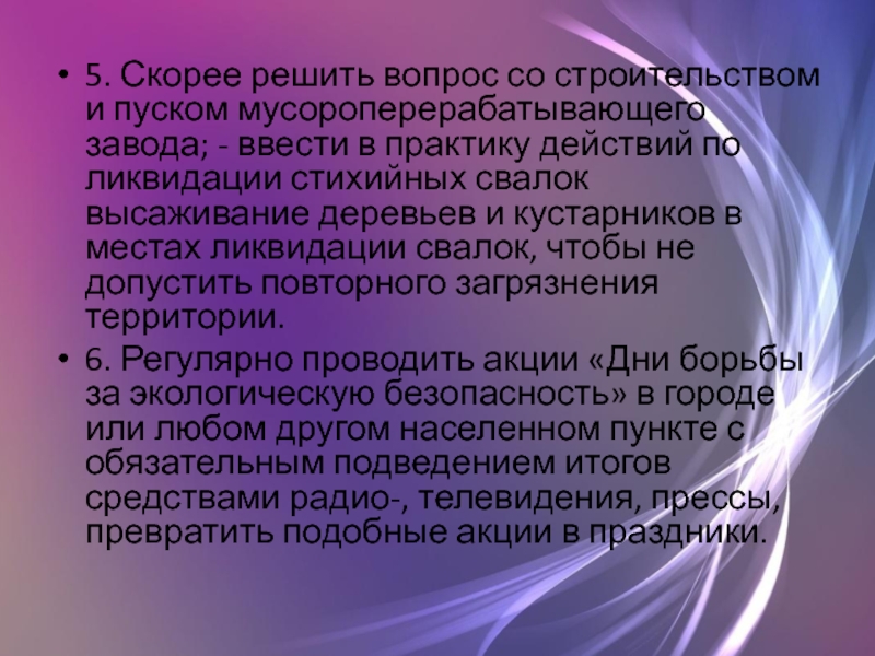 Слайд 165. Скорее решить вопрос со строительством и пуском мусороперерабатывающего завода; -