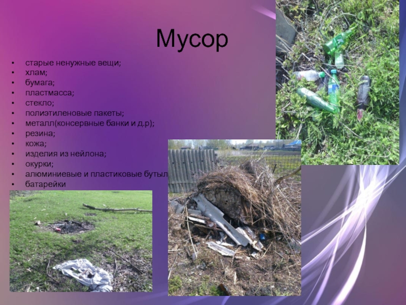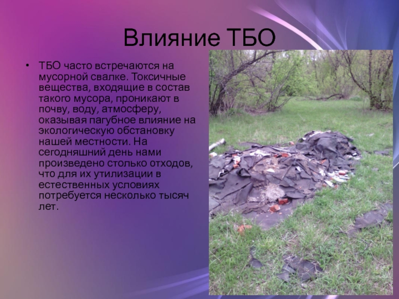 состав такого мусора, проникают в почву, воду, атмосферу, оказывая пагубное влияние на экологическую обстановку нашей местности. На сегодняшний день нами произведено столько отходов, что для их утилизации в естественных условиях потребуется несколько тысяч лет.